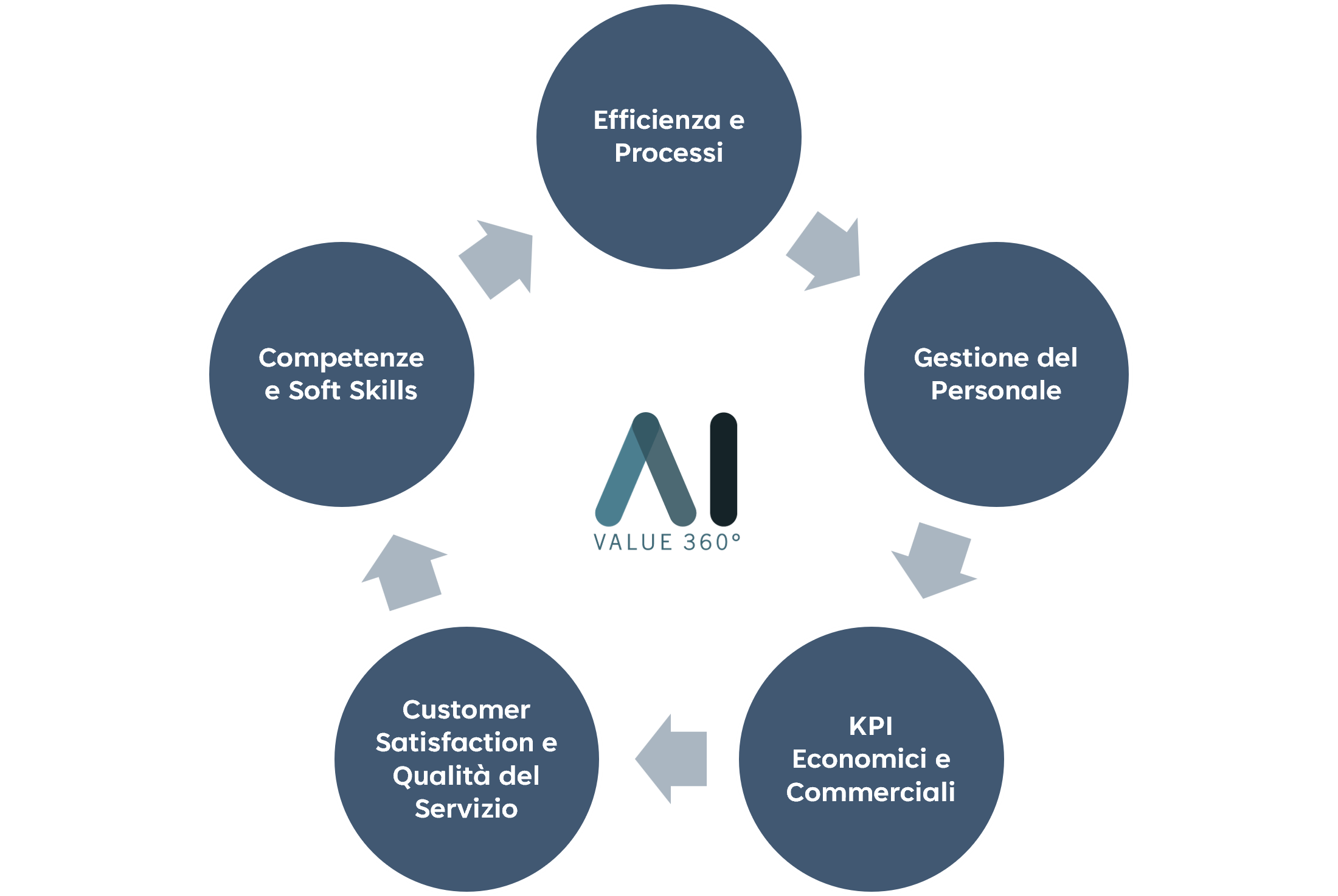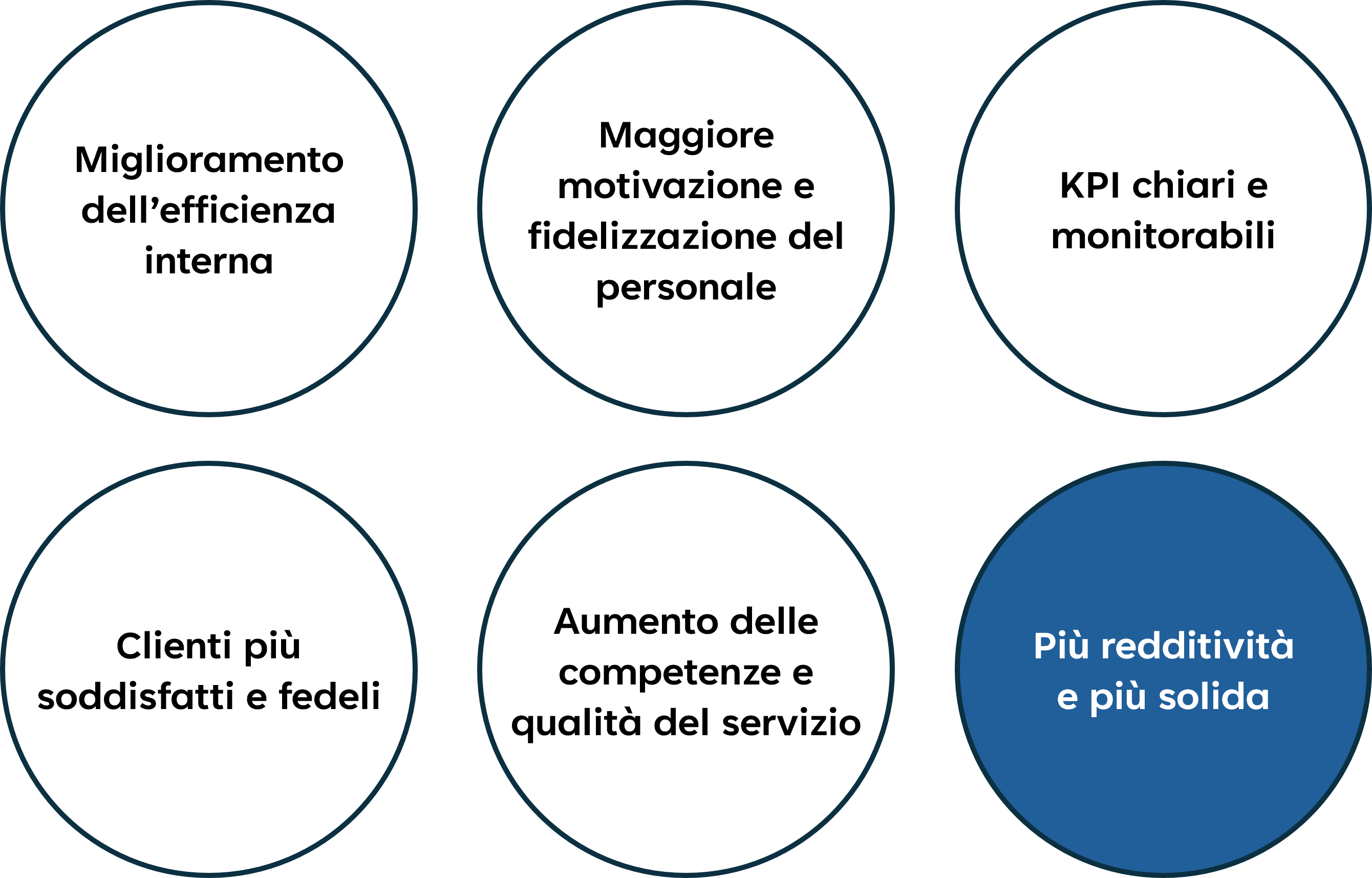 Un percorso di consulenza, ad oggi unico a livello nazionale che agisce su 5 Aree Strategiche fondamentali per la crescita: processi, persone, clienti, numeri e competenze.